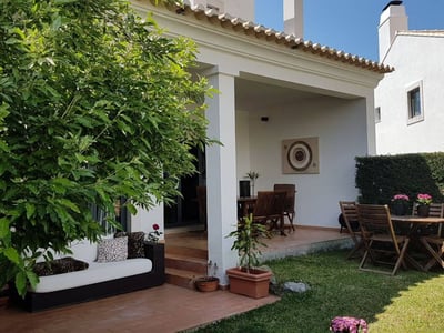 A moradia tem 2 suites com vista para o jardim/piscina, 2 quartos, 1 cozinha equipada com zona de refeições, sala de estar e zona de refeições, todos os espaços decorados de forma elegante e confortável.